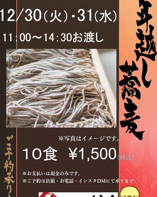 お知らせ 年越しそば その他 2025年12月02日 年越しそばご注文受付中! 12/20(土)まで年越しそばのご注文を承っております。 10食入り1箱 税込¥1,500 受渡日時 12/30(火)・12/31(水) 11:00~14:30 現金のみです。 ご希望のお客様は、店頭・お電話・インスタのDMにて承ります。 10食といっても3~4人でぺろりといけるかと思います(*^-^*) 温かいお蕎麦もいいですが、ざるそばが一番おすすめです♡ ご予約お待ちしております!! お知らせ一覧を見る
